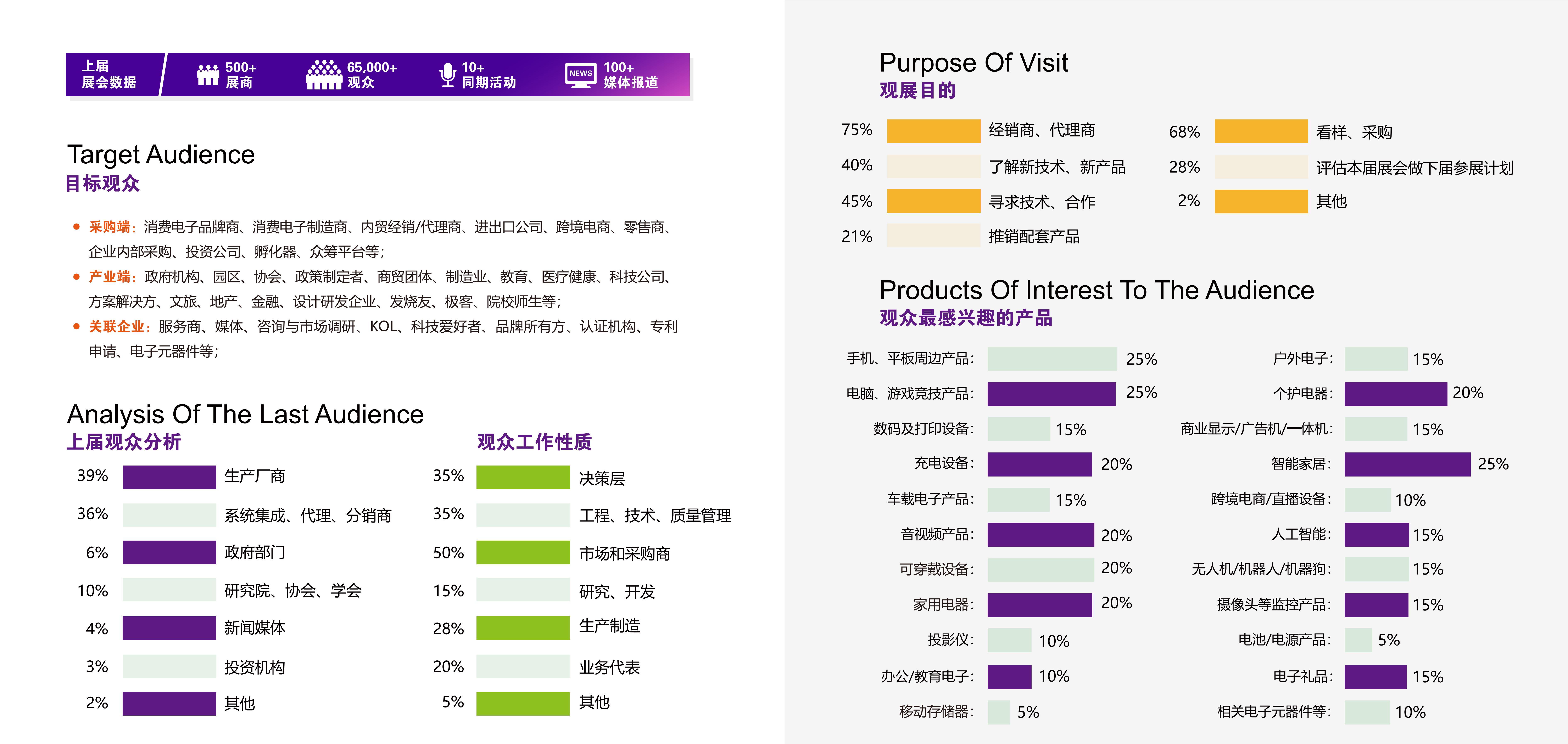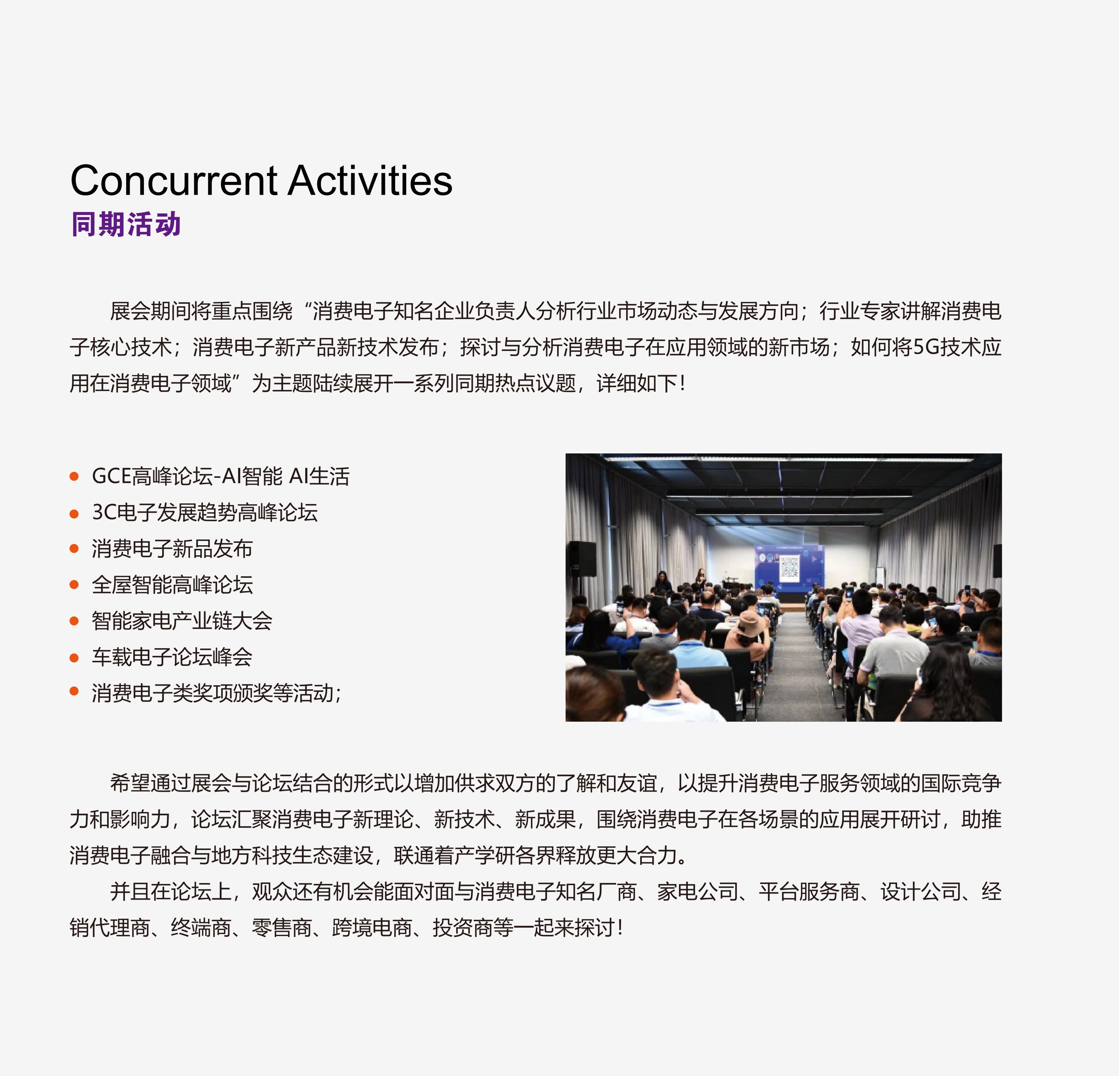 致力于为消费电子生产企业、代加工商、代理商、国内国际采购商、零配件商、相关产业服务供应商等打造全面、集中的一站式采购交易合作平台,涵盖了电脑/手机及周边产品、音视频产品、家用电器、车载电子、户外电子、智能家居、安防产品、个护电器、办公自动化及设备、电子游戏产品、智能机器人、VR/AR应用,新能源汽车等多个领域。汇聚了新品体验场景、贸易商洽机会、技术战略交流环境、品牌传播声量、多维度用户人群、跨界交流平台、为参展品牌和合作伙伴全面赋能的重要平台。