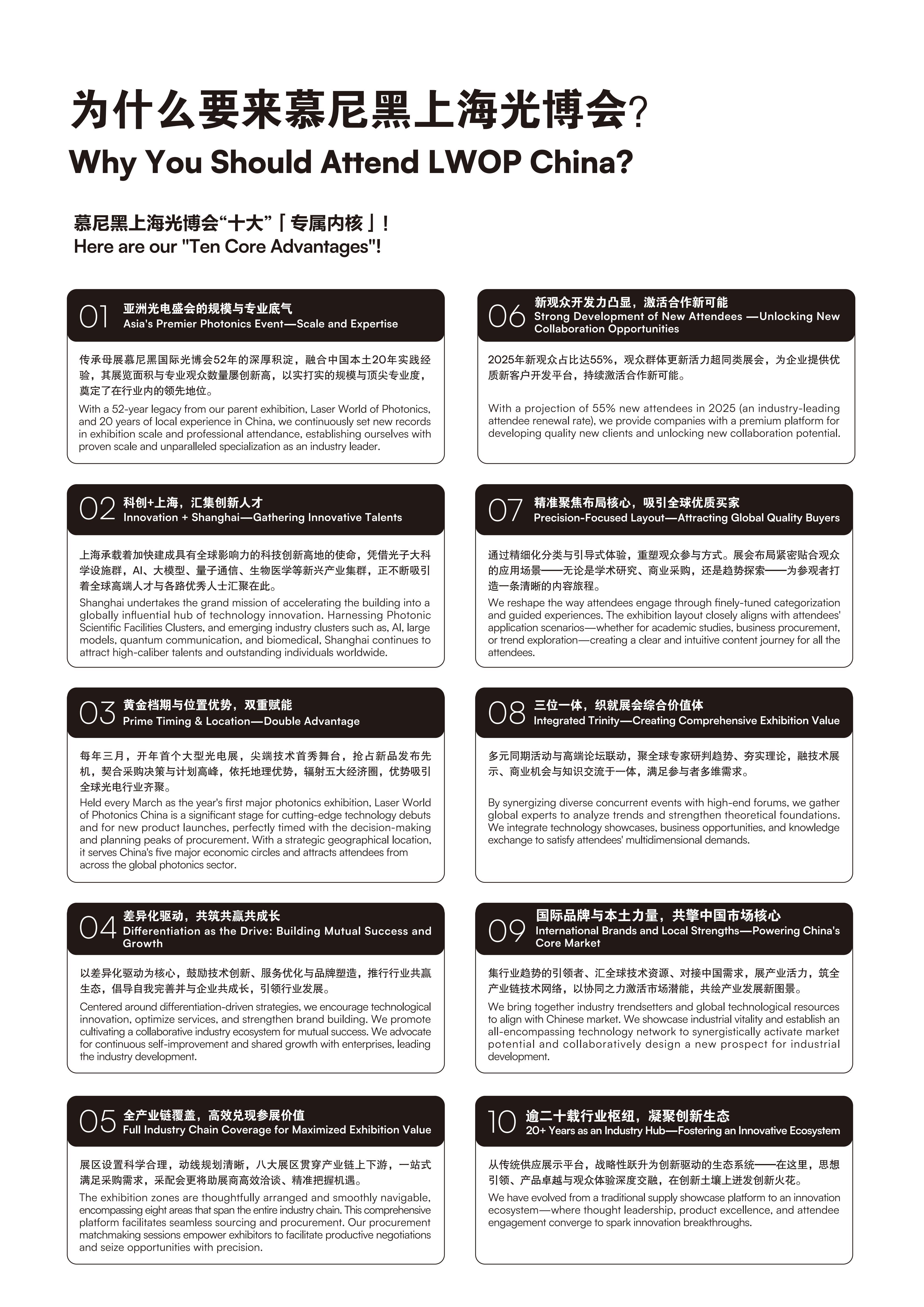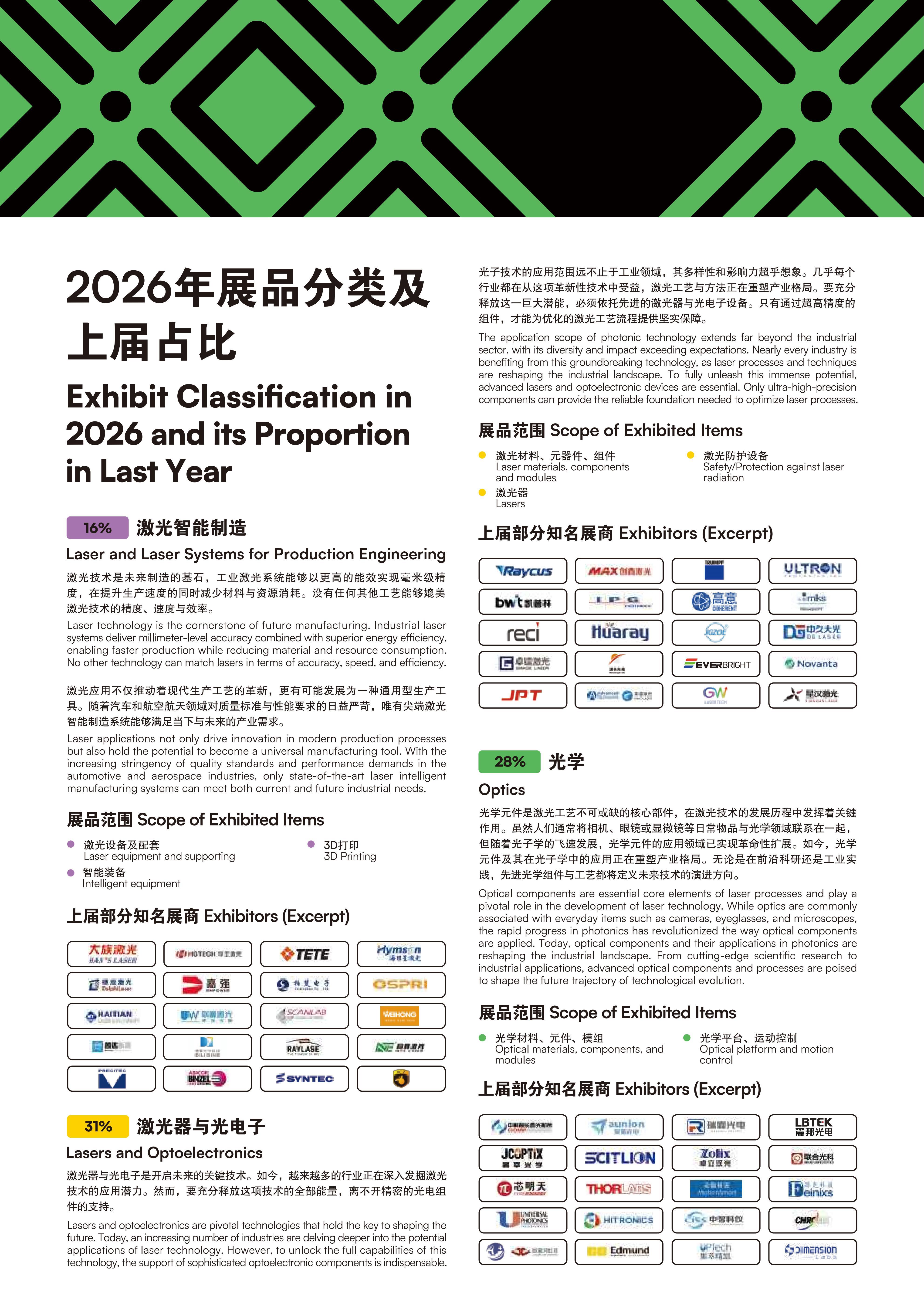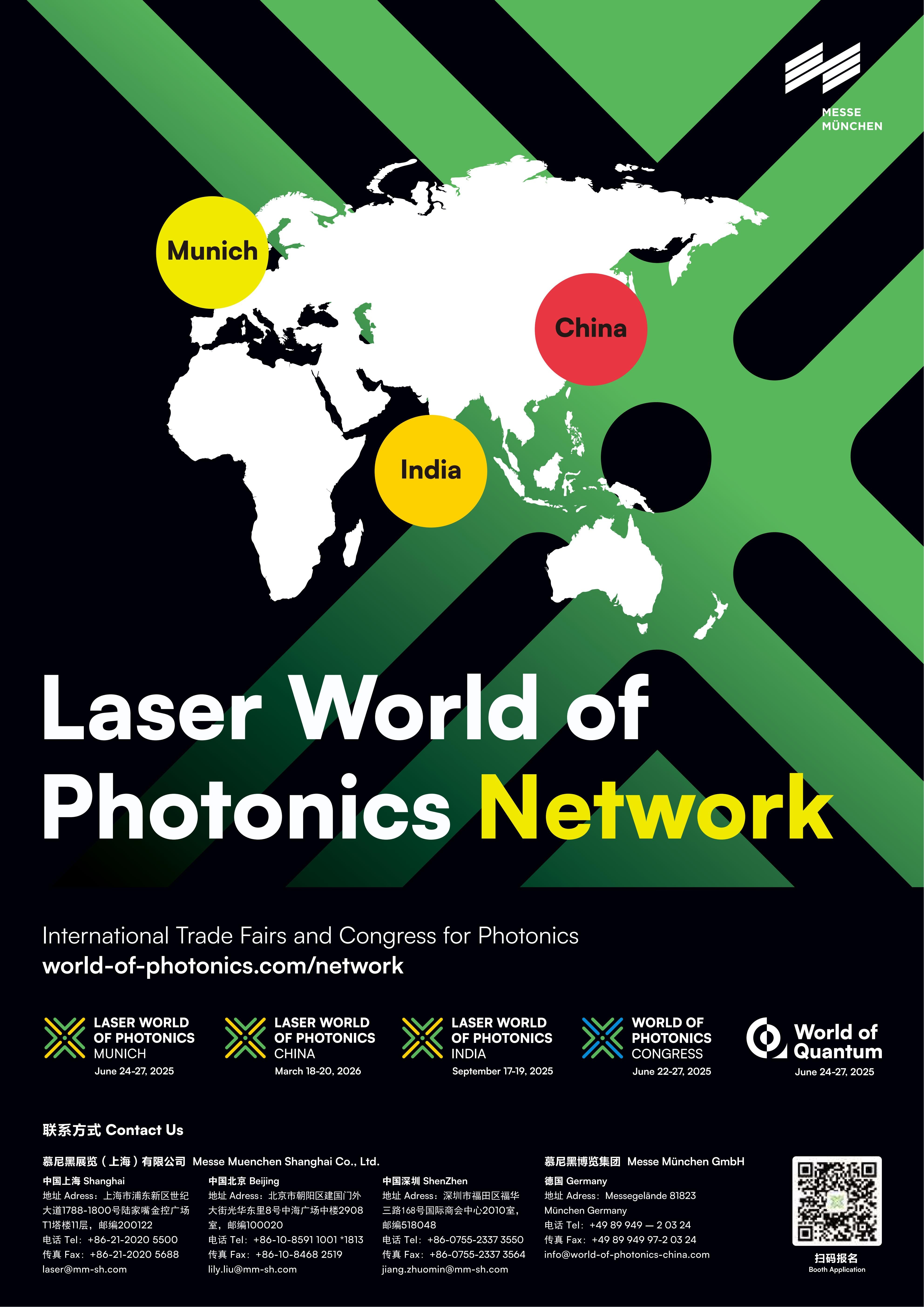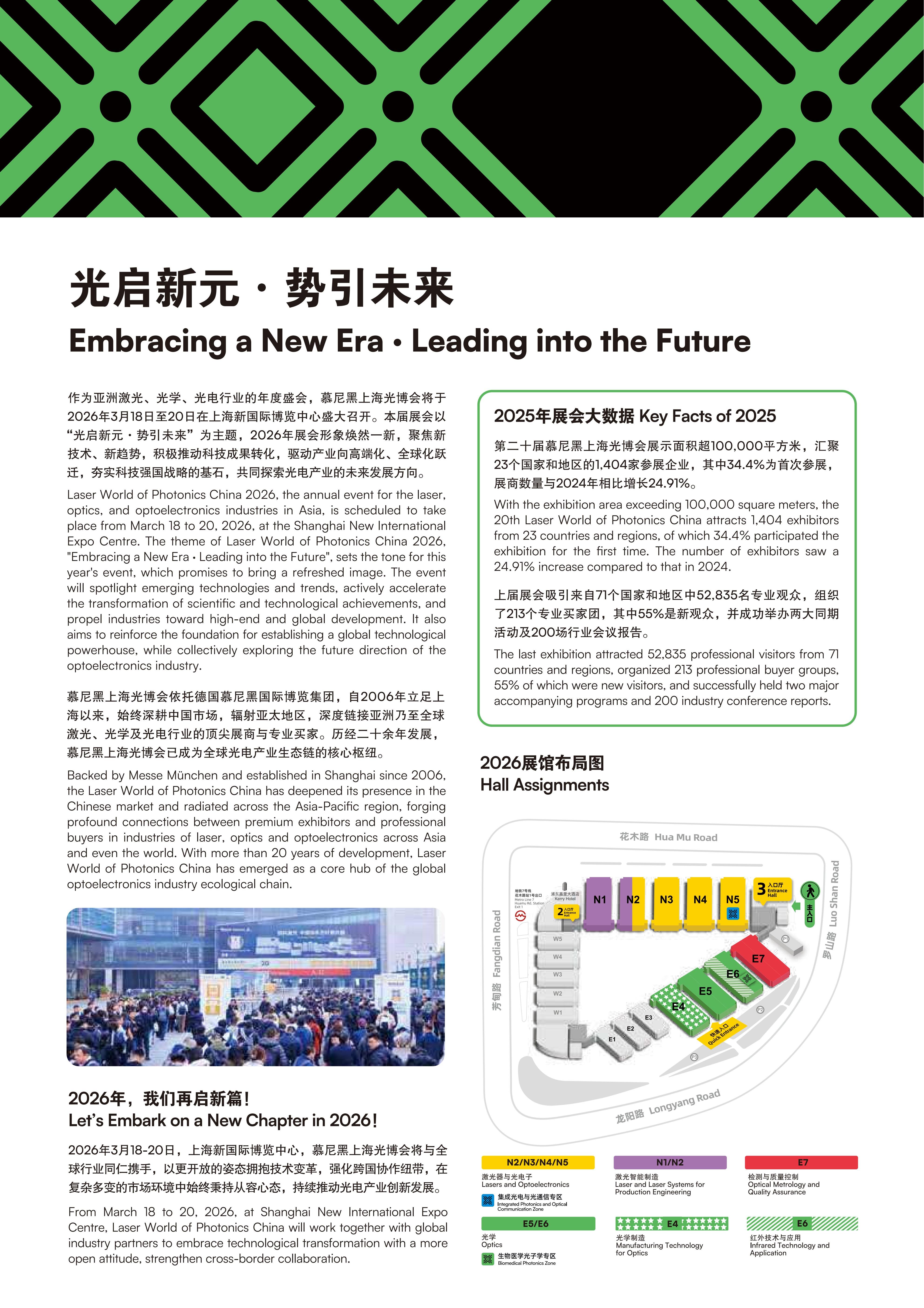 本届展会以“光启新元·势引未来”为主题,展示面积超100,000平方米,展商超过1400家,参展企业囊括来自美国、德国、日本、加拿大、新加坡、瑞士、英国、法国、中国香港、韩国、中国台湾、以色列、立陶宛、芬兰、意大利、荷兰、波兰、澳大利亚、俄罗斯、西班牙、瑞典、泰国等国家及地区的行业领军企业。 第二十一届慕尼黑上海光博会将以全新形象焕新呈现,聚焦新技术、新趋势,积极推动科技成果转化,驱动产业向高端化、全球化跃迁,夯实科技强国战略的基石,共同探索光电产业的未来发展方向。