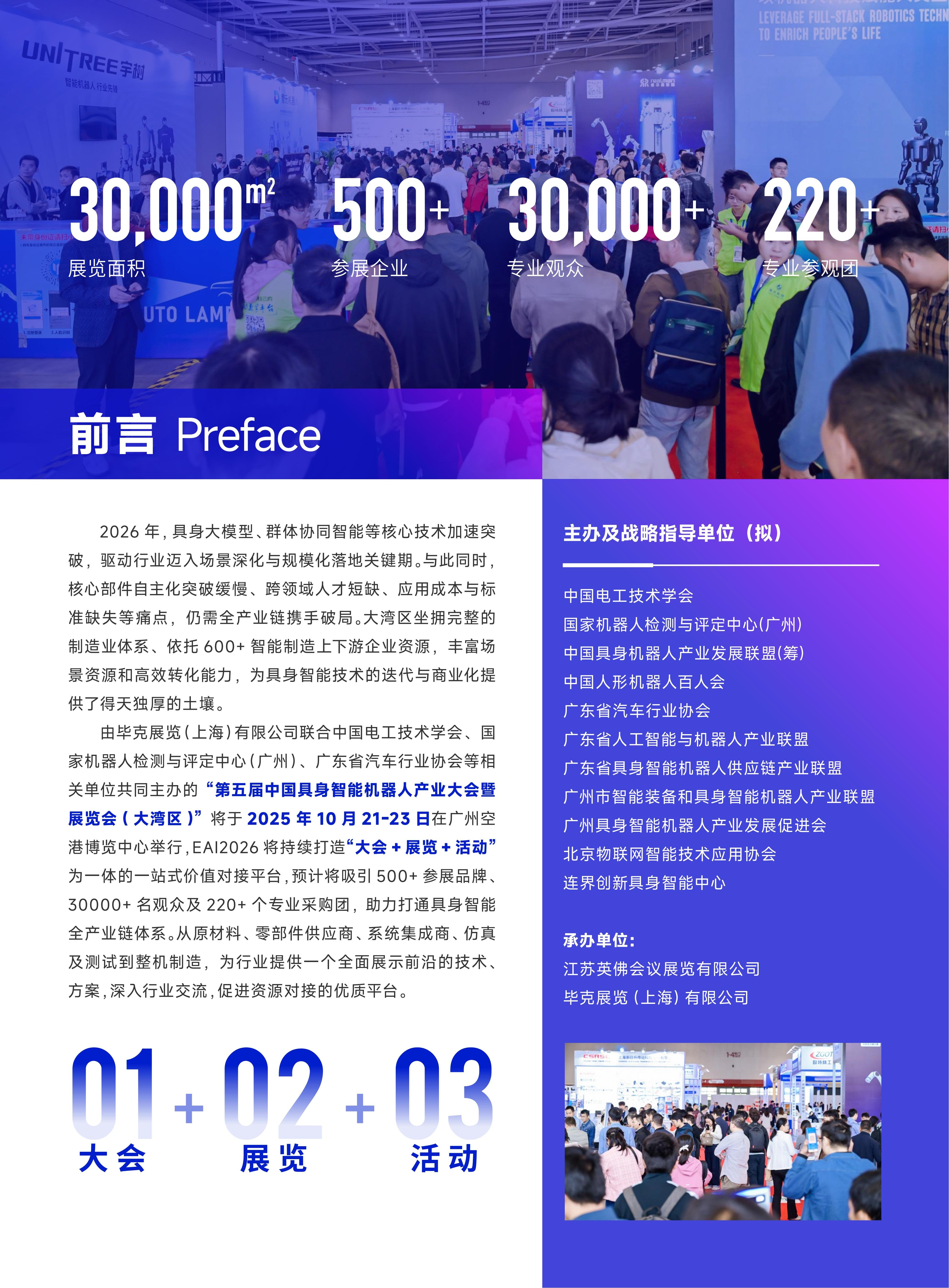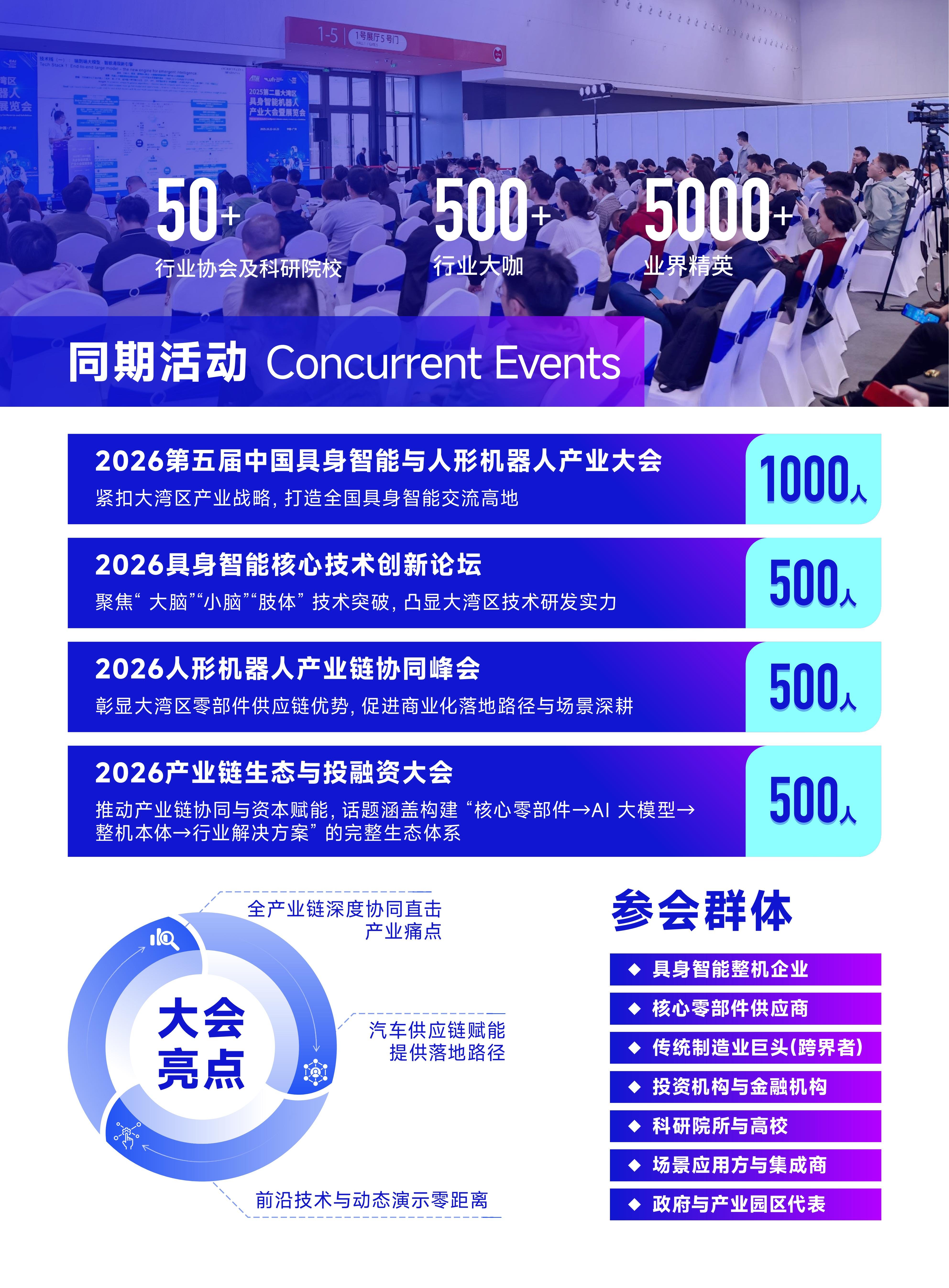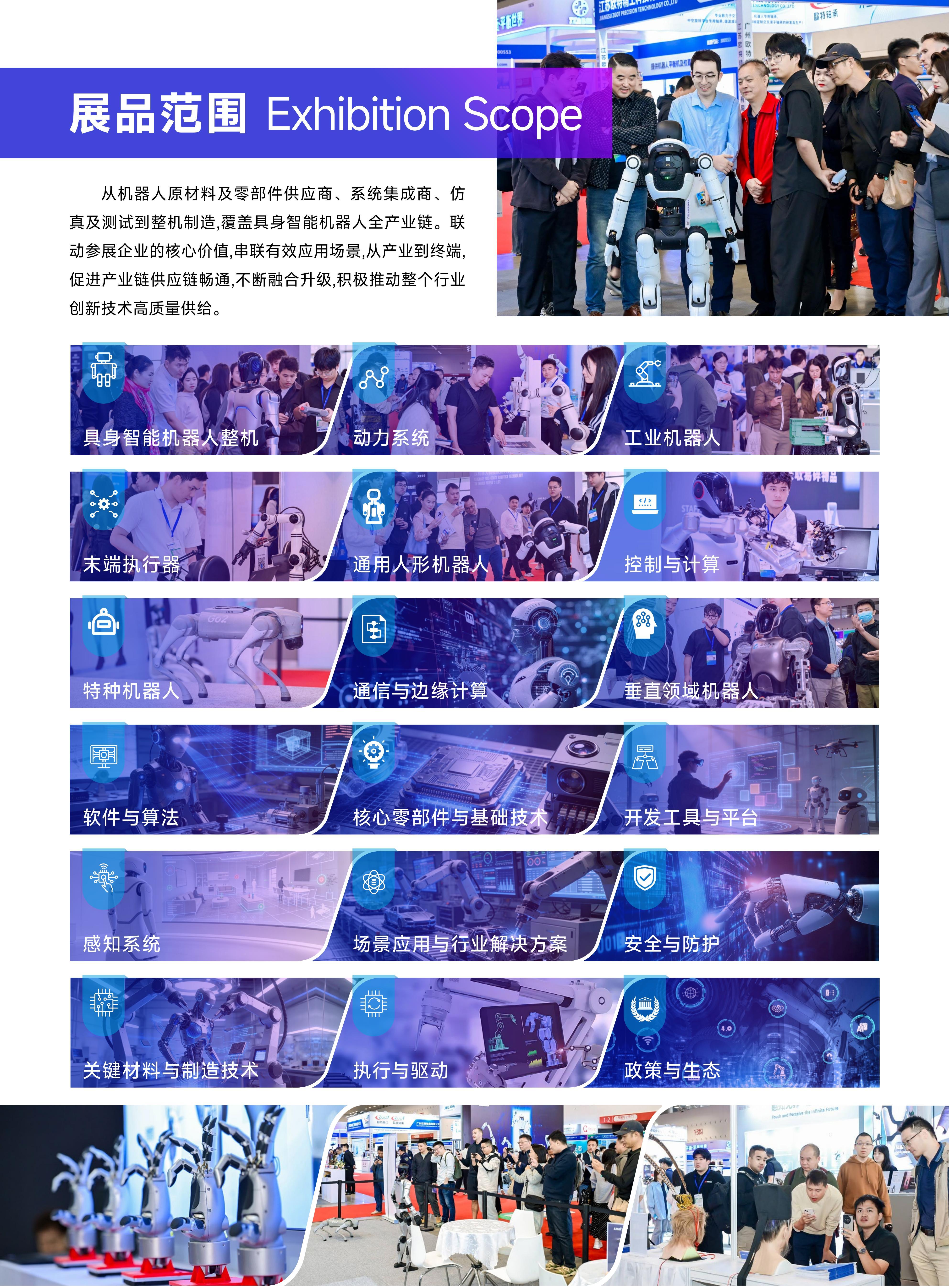 本届大会将搭配“两会两展+行业发展论坛+新产品新技术发布会”的模式,构建“会、展、技术、趋势”四位一体的核心平台体系,重点邀请具身智能头部企业参与,展示人形机器人、陪伴机器人、工业机器人等相关应用。预计将吸引400+参展品牌、30,000+名观众及20+个专业采购团,助力打通具身智能产业链,从原材料、零部件供应商、系统集成商、仿真及测试到整机制造,将为行业提供一个全面展示前沿的技术、方案,深入行业交流,促进资源对接的舞台。