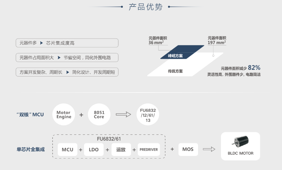 为了满足产业领域对电机控制器高集成度的要求,峰岹科技推出了集成“高速电机控制引擎”和“8051内核”的双核电机控制器。