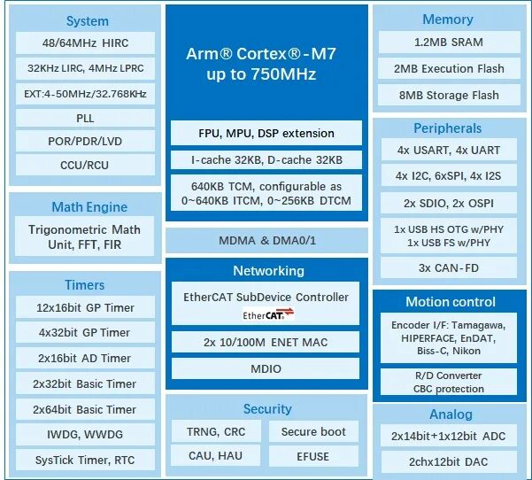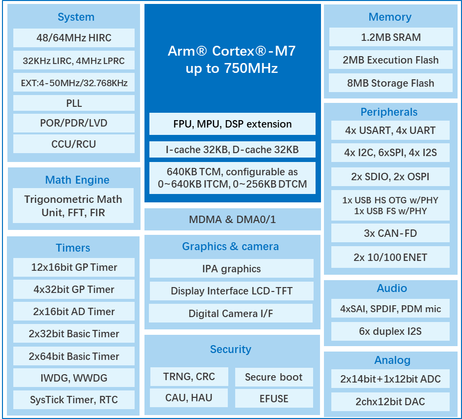 GD32H78E/77E、GD32H789/779系列MCU均基于性能强悍的Cortex®-M7内核,主频高达750MHz。该系列芯片拥有超高存储配置,最高可支持2MB Execution Flash与8MB Storage Flash,并搭载1.2MB的SRAM,更特别配备高达640KB大容量紧耦合内存(TCM),实现CPU同频运行,指令与数据的零等待执行。无论是高实时任务、复杂算法还是密集型数据处理,这一革新架构可让算力持续释放,系统响应更快、执行更稳。