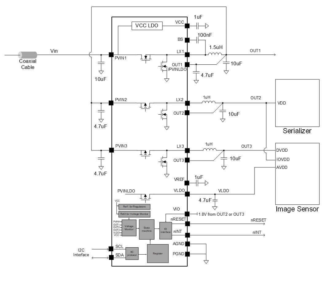 SA47366专为优化同轴电缆供电(POC)应用设计。其高压Buck1转换器支持最高18V输入,可直接承载通过同轴电缆传输的电源,无需复杂的独立供电线路,在优化车内布线的同时减轻了整车重量和装配成本。
