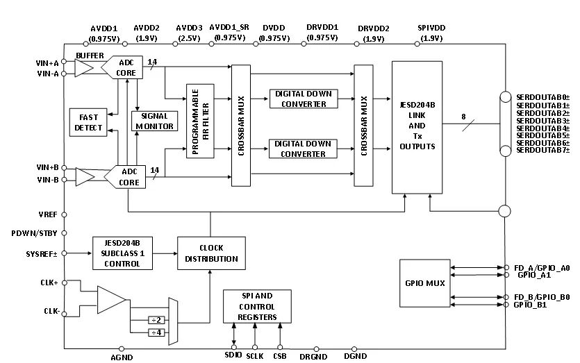 用户可以将JESD204B高速串行输出配置为单通道、双通道、四通道和八通道,具体取决于DDC配置和接收逻辑器件的可接受通道速率。通过SYSREF±和SYNCINB±输入引脚支持多器件同步。芯片串行接口速率最高支持16Gbps。