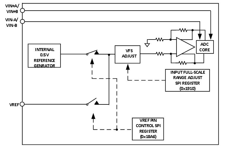 如可编程阈值检测器,允许使用ADC寄存器0x0245中的快速检测控制位来监控输入信号功率。如果输入信号电平超过可编程阈值,则快速检测指示位变为高电平。由于该阈值指示器具有低延迟,因此用户可以快速调低系统增益,以避免ADC输入出现超范围情况。