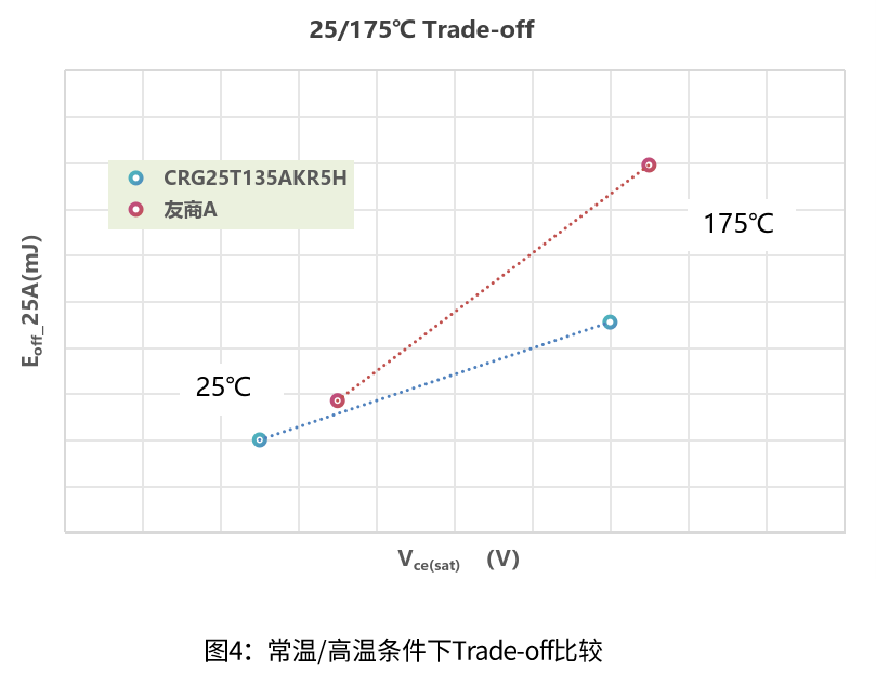 如图4所示,CRG25T135AKR5H在常温、高温条件下关断损耗具有明显优势、Trade-off有显著提升;其动态参数中的开关损耗均优于友商产品。
