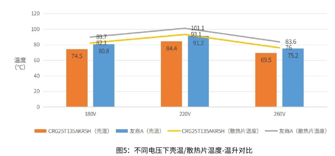 在2100W电磁炉样机上进行应用对比测试,如图5所示,在不同测试电压下,CRG25T135AKR5H壳温和散热片温度均表现良好,且明显低于友商产品。目前,该产品已在国内主流品牌的微波炉、电磁炉中实现量产应用。