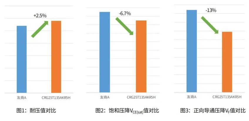 选取RC5系列中的CRG25T135AKR5H产品与国外厂商的同类RC-IGBT产品进行了实测对比。