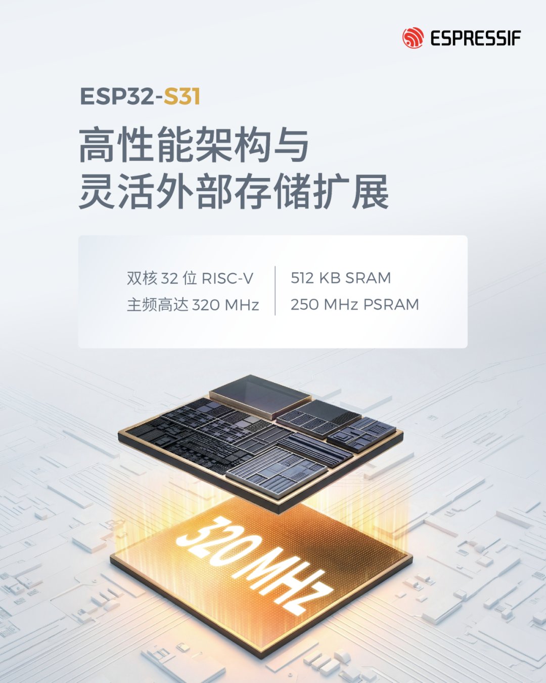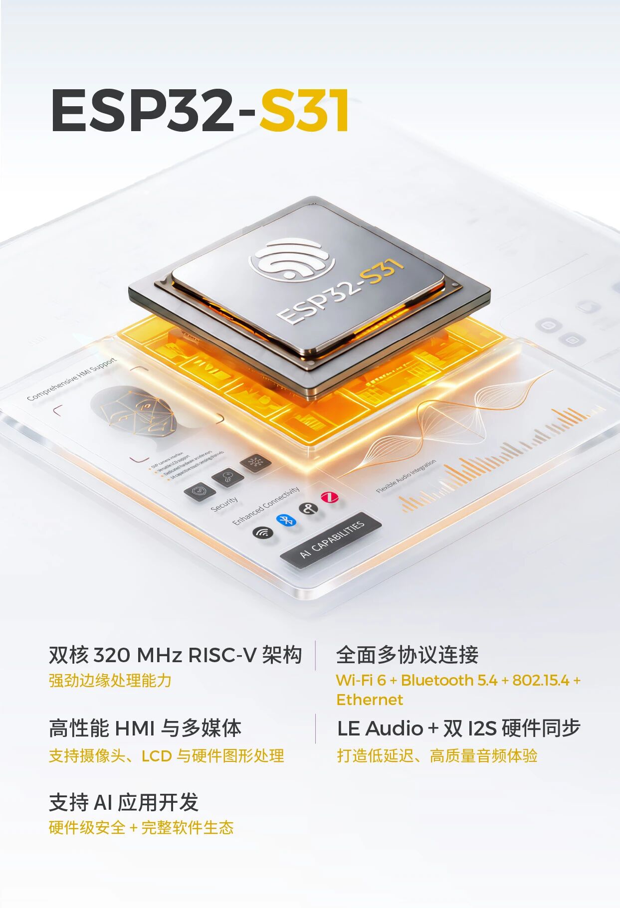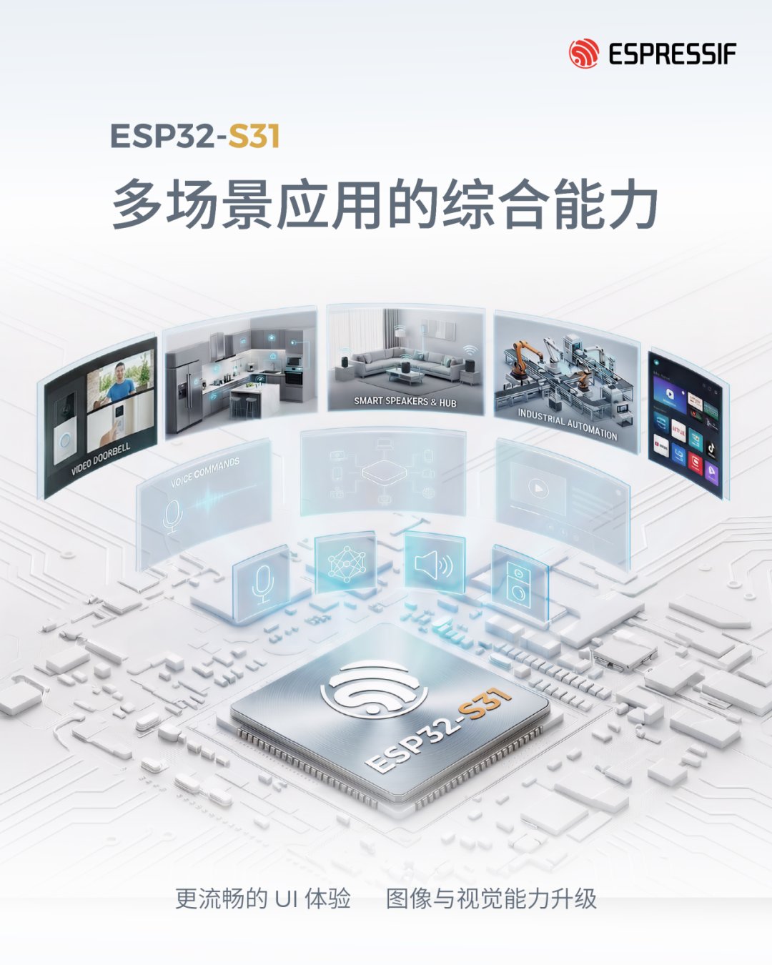 乐鑫信息科技 (688018.SH) 发布 ESP32-S31,一款高性能双核 RISC-V 多协议 SoC。基于乐鑫成熟且经过市场验证的技术积累,ESP32-S31 面向新一代 AIoT 应用打造,适用于消费类与工业设备、智能音箱、语音控制终端以及各类自动化系统等场景。通过融合多协议连接能力、边缘 AI 处理与丰富的人机交互支持,ESP32-S31 为构建高性能、智能化且安全可靠的终端设备提供了坚实基础。