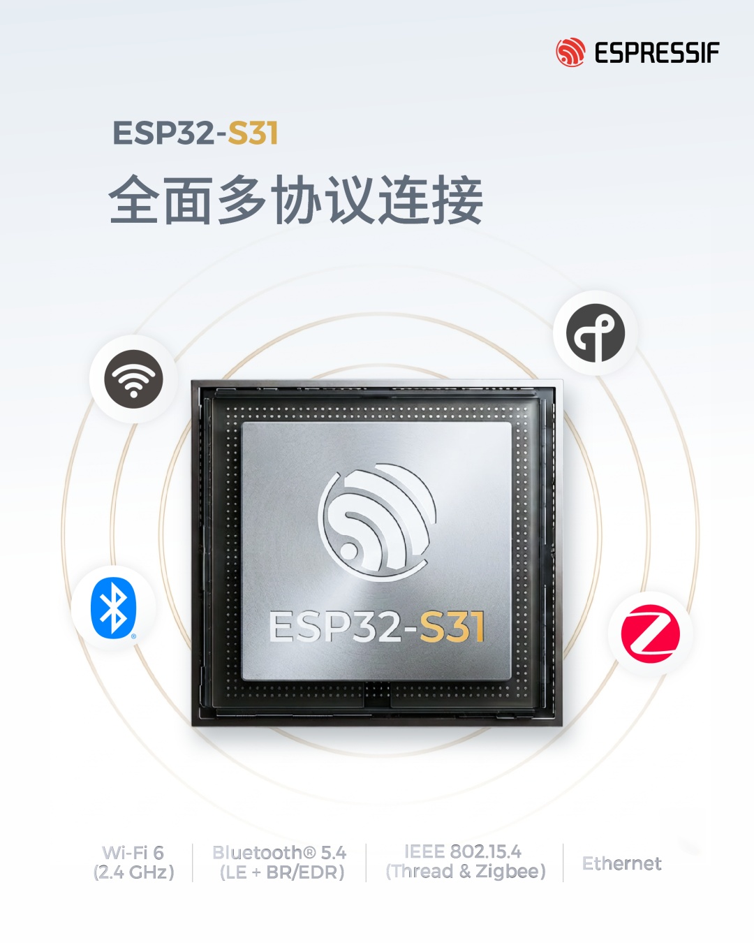 ESP32-S31 集成全面多协议连接,满足多样化 IoT 场景需求:Wi-Fi 6 (2.4 GHz) 提升了传输效率并降低了功耗,适用于电池供电设备;Bluetooth 5.4 引入 LE Audio,实现高质量无线音频传输,支持方向查找以实现精准定位服务,并支持 Bluetooth Mesh 1.1 以实现可扩展的设备通信;同时,Bluetooth Classic (BR/EDR) 确保与传统音频设备的兼容性,并满足低时延、高吞吐应用需求。芯片同时支持基于 Wi-Fi 与 Thread 的 Matter 协议,实现跨生态设备的无缝连接。