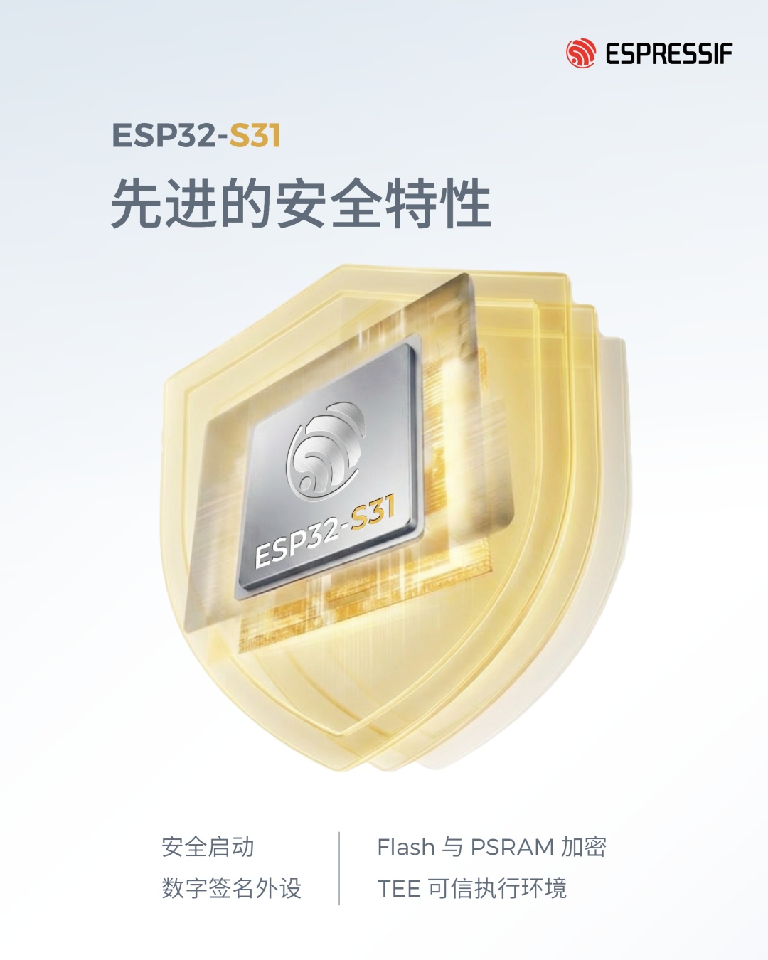 ESP32-S31 采用多层次硬件安全机制,满足严格的行业安全要求。芯片支持安全启动、Flash 与 PSRAM 加密、数字签名外设以及加密硬件加速,并具备抗侧信道攻击与电源故障注入防护能力。通过集成支持访问权限管理 (APM) 的可信执行环境 (TEE),实现软件隔离,支持安全的多应用部署。