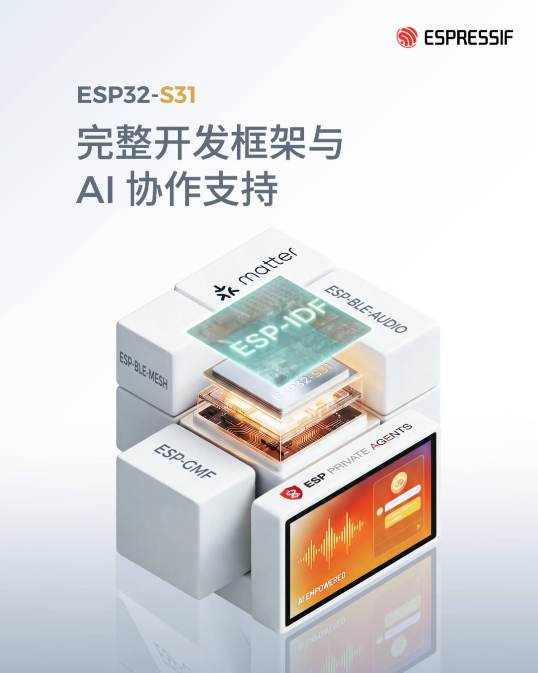此外,ESP32-S31还可在 ESP-Hosted 和 ESP-AT 框架支持下作为连接协处理器使用。ESP32-S31 同时支持乐鑫私有化智能体平台,并可直接与 LLM 协作,构建运行或交互 AI Agent 的客户端设备,实现语音赋能与智能化应用。
