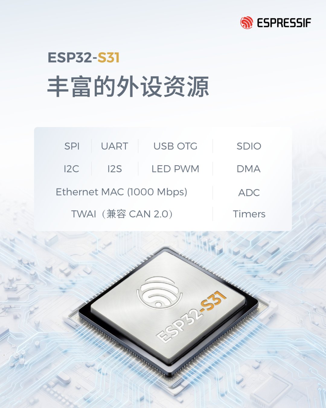 ESP32-S31 集成丰富的外设接口,包括 USB OTG、TWAI(兼容 CAN 2.0)、以太网 MAC (1000 Mbps),以及 I2C、I2S、SPI、UART、LED PWM、ADC、SDIO、定时器和 DMA 等标准接口。