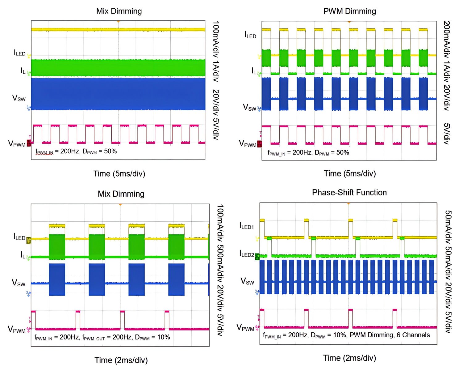 图3 模拟调光、PWM调光、混合调光及带移相功能的调光方式下的典型波形