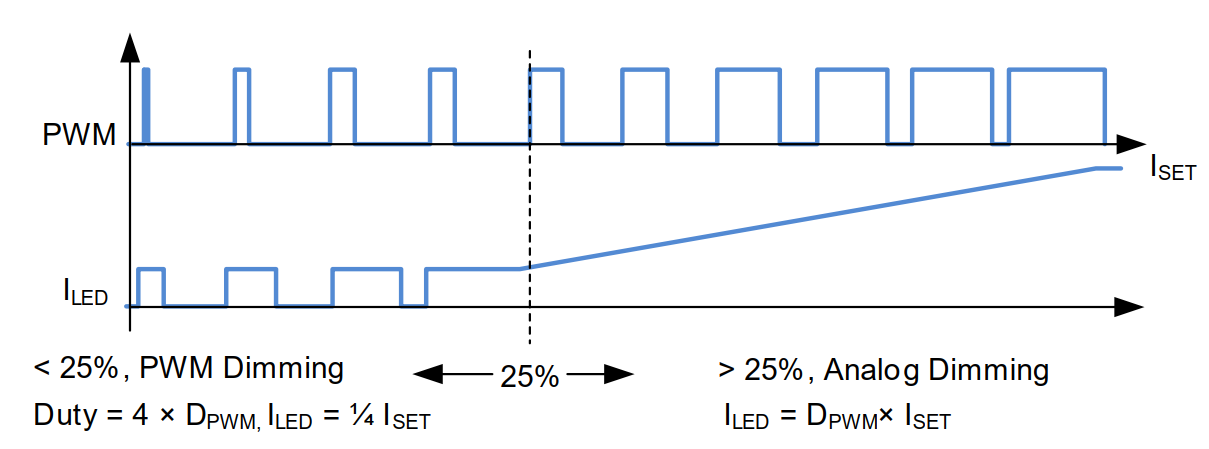PWM调光 以固定峰值电流驱动LED,通过调节占空比控制平均亮度,电流波形始终保持最大幅度,LED的色温和光谱在整个亮度范围内都能保持一致。具备高效率、高精度以及出色的亮度一致性等特点。