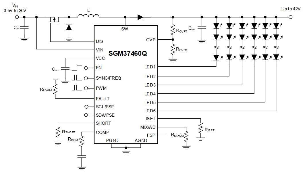 圣邦微电子推出SGM37460Q,一款专为车载智能座舱中的中控屏、仪表盘及抬头显示(HUD)等应用推出的六通道、集成前级升压(Boost)转换器的车规级背光LED驱动芯片。