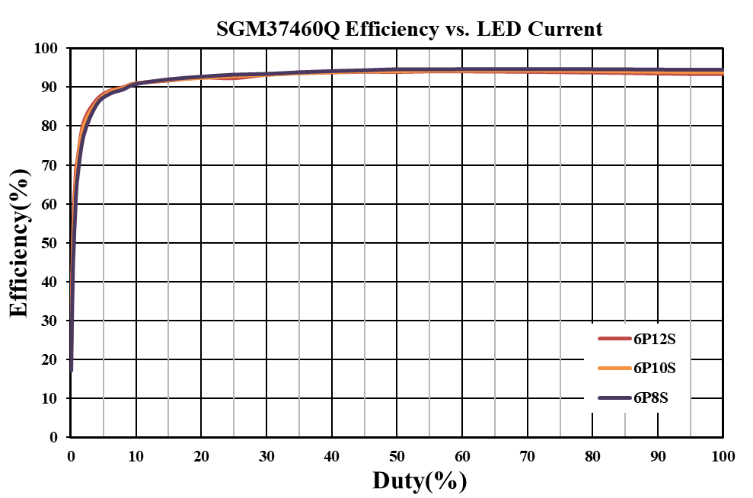 SGM37460Q内置了一颗Boost下管,其典型的导通阻抗仅90mΩ,显著降低导通损耗。结合芯片出色的驱动电路设计,SGM37460Q的Boost变换器效率可达94%。(测试条件:VIN = 12V,ISET = 100mA,LED灯串配置为6通道×12串每通道)