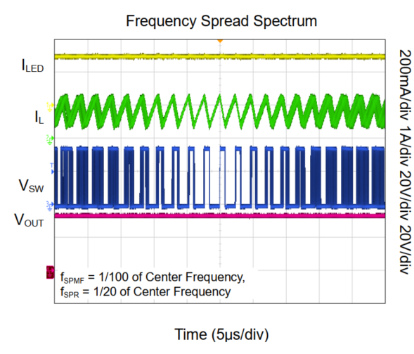 SGM37460Q采用开关频率抖动(抖频)技术,有效分散EMI能量分布,降低开关基频及其高次谐波处的峰值干扰电平。该机制显著削弱频谱尖峰,提升系统EMI裕量,在不增加滤波器或磁件成本(方便,低成本)的前提下优化整体电磁兼容性能。工程师们可以通过I²C或外围电阻灵活配置调制频率和深度,以适应不同应用场景。