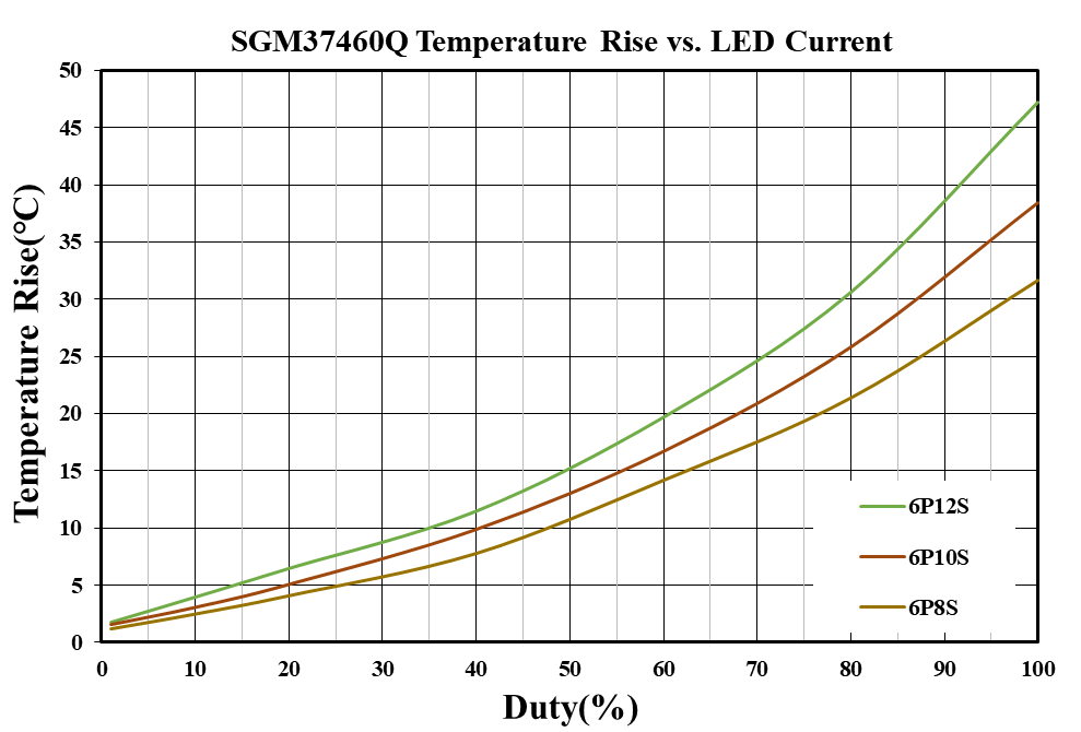 除Boost变换器的高效率外,SGM37460Q还具有LED各通道的低余量电压(Headroom Voltage)的优势,进一步降低系统损耗。结合低热阻系数的QFN封装,SGM37460Q的温升表现优于同类方案。
