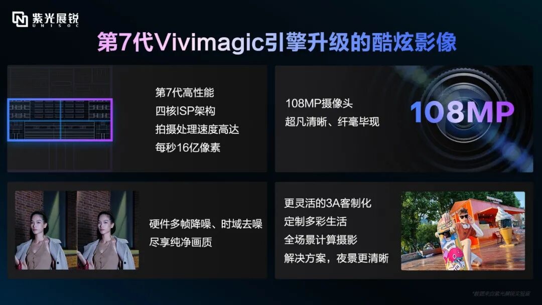 紫光展锐T8300搭载了第7代Vivimagic影像引擎,影像效果全面升级。全新第7代四核ISP,拍摄处理速度达每秒16亿像素,支持1.08亿像素拍摄,以及32MP@25fps、16M+16M双摄ZSL拍照,让每一帧画面都细腻入微,清晰可见。在降噪能力方面,T8300支持MFNR(硬件多帧降噪)和TNR(硬件时域降噪),提供更为清晰、细腻的图像效果。