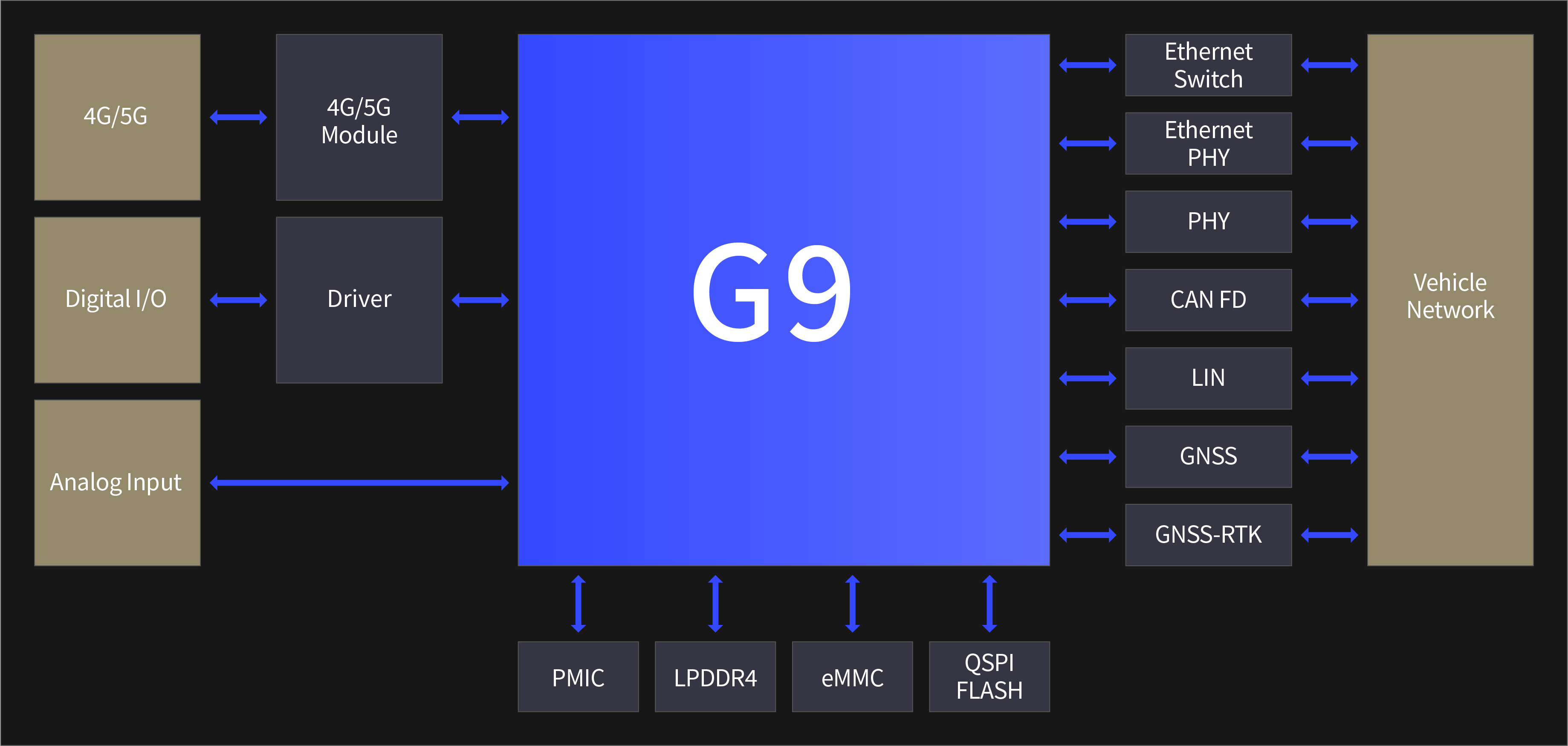 参考设计搭载G9H高性能处理器,提供6个Cortex-A55和3对双锁步Cortex-R5算力,同时集成10Gbps的PCIe扩展多路Switch, CAN-FD、LIN网络接口及SDPE网络加速引擎,帮助客户快速评估中央网关及中央计算平台所需要的算力及网络传输需求。