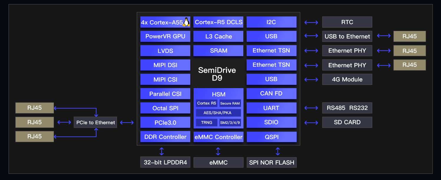 参考设计搭载芯驰D9工业芯,展示了可靠的安全启动与强大的多系统同时运行,利用D9芯片丰富的外设接口,可支持两路时间敏感以太网接口和多路通用以太网接口,配置了丰富的RS485/RS232通讯接口。帮助客户在满足系统可靠与安全的条件下,实现工业网关机所需的极其丰富的外设接口需求。